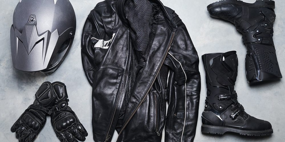 A motorcycle helmet, leather jacket, gloves, and riding boots—essential motorcycle safety gear—are laid out on a gray surface.
